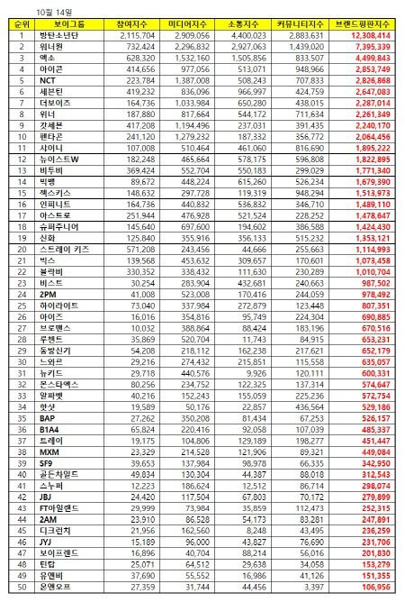 Viện Nghiên cứu Kinh doanh Hàn Quốc vừa công bố BXH giá trị thương hiệu tháng 10 dành cho các nhóm nam. Theo đó, 72.090.781 mẩu dữ liệu đã được phân tích từ ngày 12 tháng 9 đến hết ngày 13 tháng 10. Kết quả là BTS đã dẫn đầu với tổng cộng 12.308.414 điểm. Xếp thứ hai là Wanna One với 7.395.339 điểm. EXO chốt hạ Top 3 với 4.499.843 điểm.