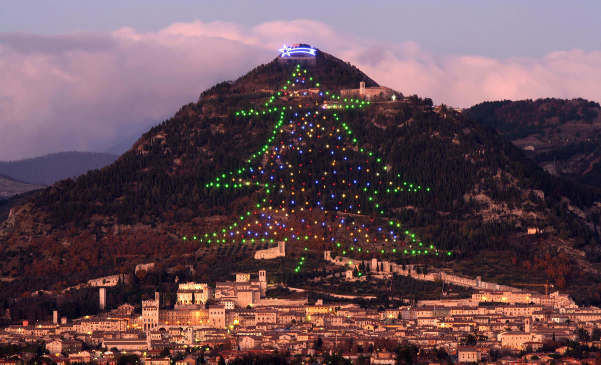 Gubbio (Italy): Tọa lạc tại sườn núi Ingino, cây thông Noel có diện tích bề mặt rộng bằng 5 sân bóng đá trở thành niềm tự hào của đất nước có hình chiếc ủng. Cây thông này cao hơn 650 m và bắt đầu hoạt động từ mùa Giáng sinh năm 1981. 300 bóng đèn màu xanh ở phần rìa đã tạo nên hình dáng cây thông. Phần trung tâm tỏa sáng lấp lánh với hơn 400 bóng đèn đủ màu sắc. Ngôi sao phía trên đỉnh được cấu thành từ hơn 250 bóng đèn.