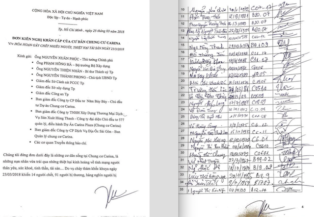Trong đơn kiến nghị, cư dân Carina cho rằng, vụ cháy thảm khốc xảy ra vào khuya 23/3 khiến 13 người chết, 91 người bị thương, hàng nghìn người bị khủng hoảng tâm lý trầm trọng, hàng tỷ đồng dành dụm cả đời bị thiêu rụi và hiện đang sống vô gia cư...