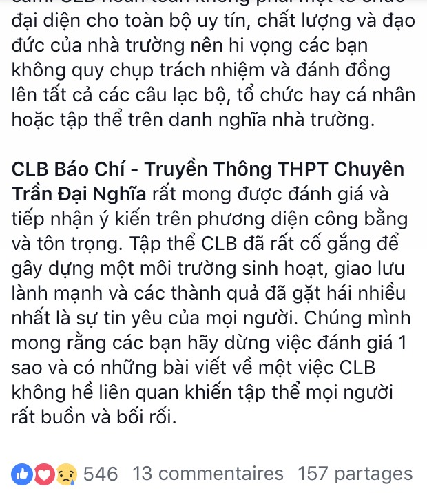Về phía các CLB trường THPT chuyên Trần Đại Nghĩa, sau khi bị đồng loạt bị đánh giá 1 sao, rất nhiều các học sinh, và cả nhiều thầy cô của trường vào page các CLB đánh giá 5 sao để “cứu nguy”, và hiện tại CLB Báo chí - Truyền thông THPT của trường đã “hồi sinh” với 4.9/5.0 sao.