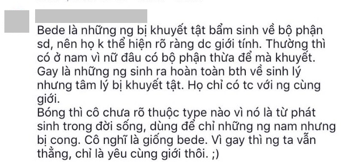 Hoàng Khôi (học sinh trường THPT Nguyễn Hữu Huân, Q.Thủ Đức, TP.HCM), là một thành viên của cộng đồng LGBT, khi biết tin này đã vô cùng bức xúc: “Mỗi con người có cách nhìn nhận cá nhân về một vấn đề. Cô giáo ấy có cách nhìn nhận của cô, và bạn có cách nhìn nhận của bạn. Bạn có quyền không chấp nhận ý kiến của cô giáo này, nhưng việc bạn đi theo đám đông để “trút giận” lên các CLB của trường vì phát ngôn của một giáo viên trong trường là hoàn toàn sai, vô căn cứ. Nếu bạn muốn bảo vệ thứ giới thứ ba, đúng ra bạn phải có những lý lẽ thuyết phục để mọi người tin rằng phát ngôn của cô giáo này là lạc hậu, lỗi thời, chứ không phải trở thành một người bảo vệ bị “mù quáng” như thế”.