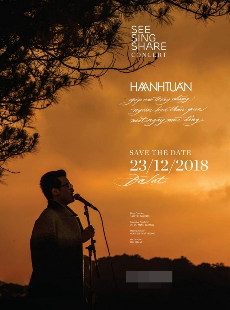 Như đã thông báo trước đó chiều qua (29/10), Hà Anh Tuấn đã có buổi livestream để công bố việc bán vé chính thức cho concert See Sing Share sẽ diễn ra vào ngày 23/12/2018 tới đây tại trường Cao đẳng Sư phạm Đà Lạt.