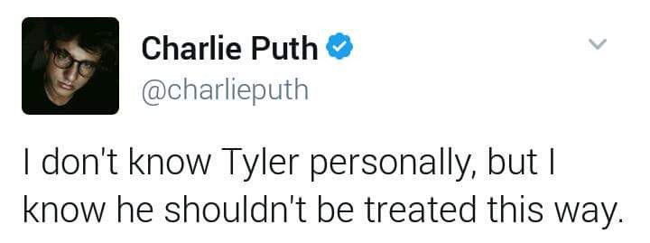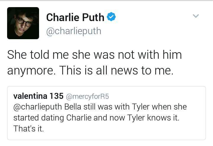 Charlie Puth tỏ ra thông cảm với Tyler Posay khi tweet rằng: “Tôi không biết về con người của Tyler, nhưng tôi biết cậu ấy không nên bị đối xử như vậy.” Anh chàng cũng đã nhanh chóng viết những dòng cuối cùng để chấm dứt câu chuyện này trong yên bình, rằng anh cũng sẽ kết thúc với Bella Thorne.