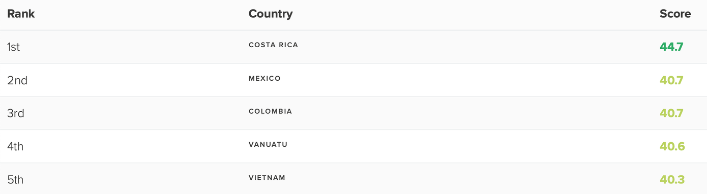 Theo công thức đó, Costa Rica là nước hạnh phúc và xanh nhất thế giới. Phương pháp tính của NEF cho thấy tuổi thọ trung bình của người dân Costa Rica là 79,1. Costa Rica cũng sử dụng 99% năng lượng tái tạo.