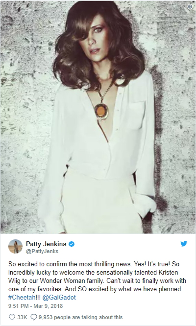 Mới đây, trên trang Twitter cá nhân của mình, đạo diễn Patty Jenkins đã chính thức xác nhận: Nữ diễn viên Kristen Wiig sẽ đảm nhiệm vai phản diện Cheetah trong Wonder Woman 2. “Thật hào hứng khi được xác nhận tin vui này. Đúng, đây chính là sự thật. Chúng tôi rất may mắn khi được chào đón nữ diễn viên cực kỳ tài năng Kristen Wiig vào gia đình Wonder Woman. Tôi đang rất nóng lòng được làm việc với một trong những tên tuổi mình yêu thích nhất. Những gì chúng tôi đã vạch ra đều rất đáng trông đợi #Cheetah @GalGadot”.