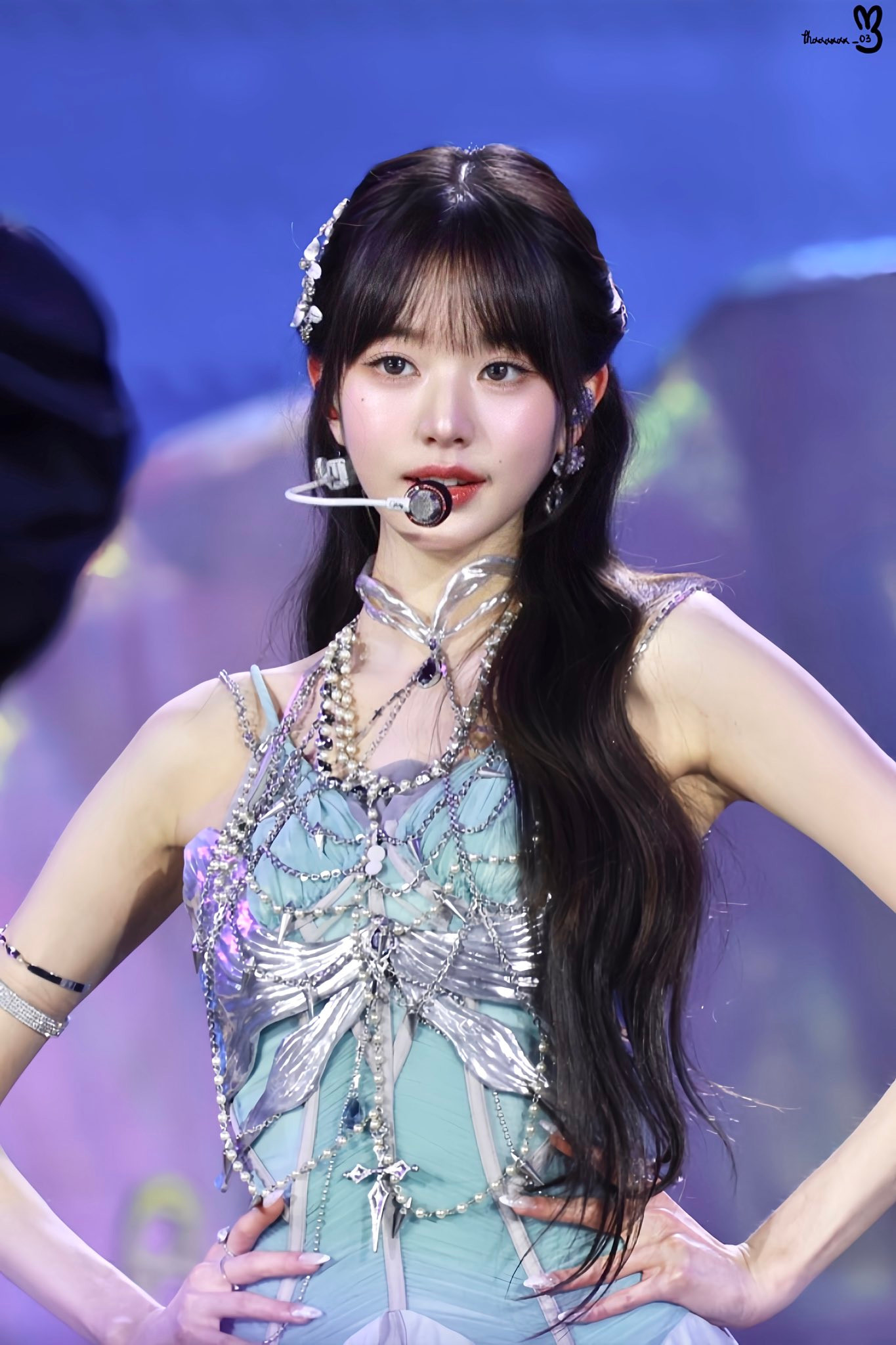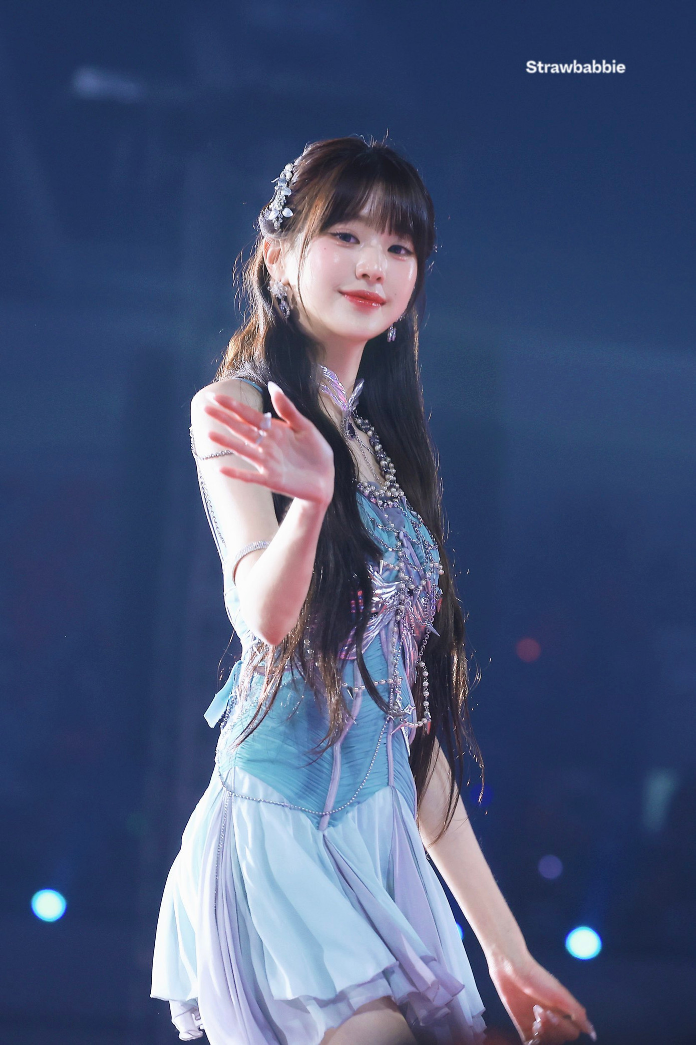 Trang phục có nhiều layer nhưng không rối mắt hay tạo cảm giác nặng nề, mà giúp Wonyoung càng xinh đẹp, lung linh, toát lên nét thanh thoát, trong veo tựa nàng tiên. Outfit này cũng hòa hợp với concept tiên cá, đại dương mà nhóm mang lên sân khấu GDA 2024.