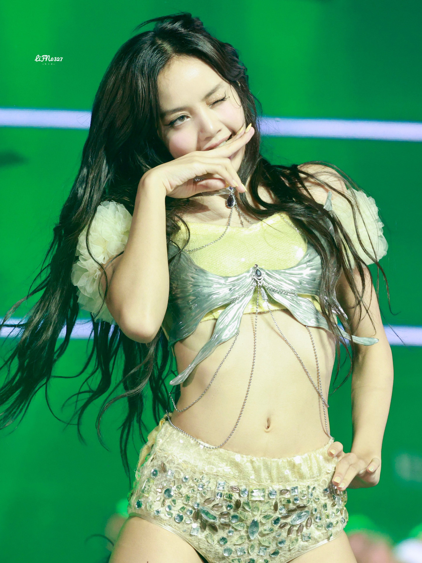 Corset từ thương hiệu Mermaid Lucia mà Wonyoung mặc cũng từng được Lisa diện trong world tour Born Pink. Nàng út của BLACKPINK diện nó khi biểu diễn MONEY ở đêm thứ 2 của encore concert hồi tháng 9 tại Seoul (Hàn Quốc). Cùng một chiếc corset nhưng Lisa lại cho thấy khí chất đối lập với Wonyoung - quyến rũ, táo bạo và cá tính hơn.
