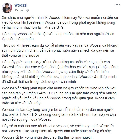 Woossi biết rằng phát ngôn của mình đã gây ra tổn thương lớn đối với các bạn fan yêu mến T-Ara, BTS cũng như là gây thất vọng đến những người đã yêu mến và ủng hộ Woossi trong thời gian qua. Woossi cảm thấy rất tiếc về điều này!