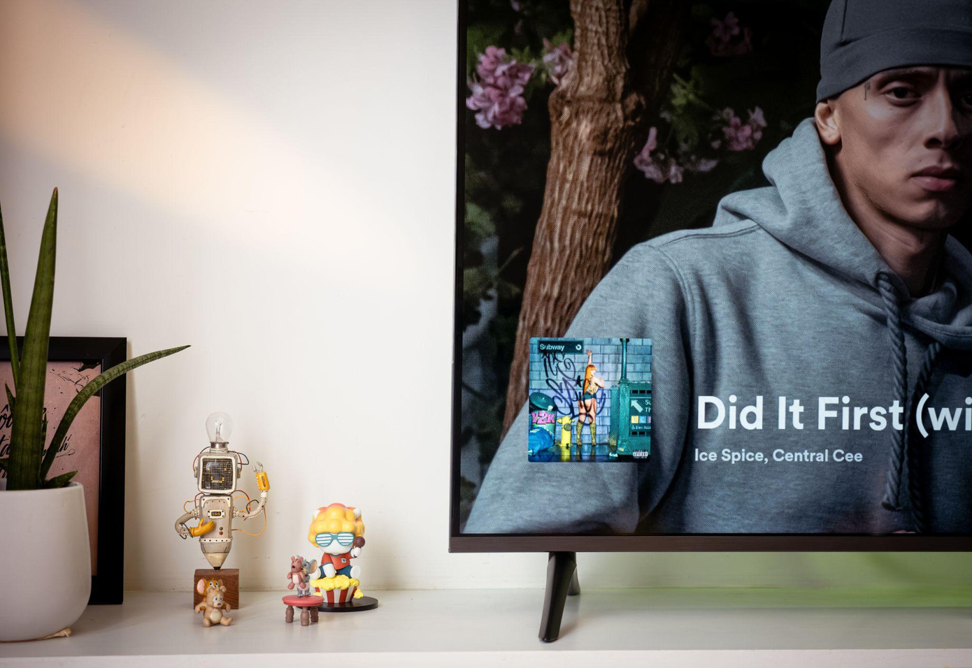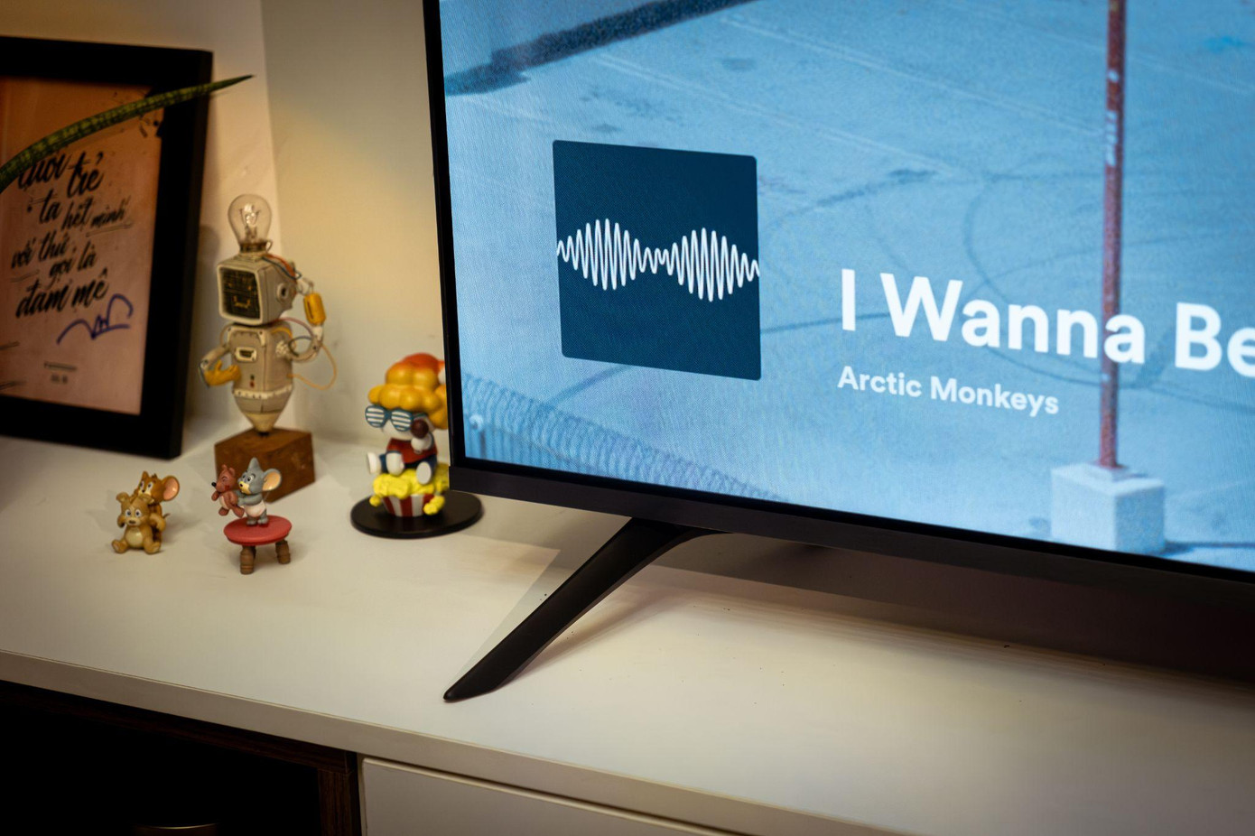Điểm đáng chú ý là chân đế của tivi được nâng cao hơn một chút, tạo ra khoảng trống lý tưởng để trang bị thêm soundbar. Giờ đây, người dùng có thể dễ dàng đặt loa ngay dưới cạnh tivi mà không gặp bất kỳ trở ngại nào, mang đến trải nghiệm âm thanh tuyệt vời và hoàn hảo hơn.