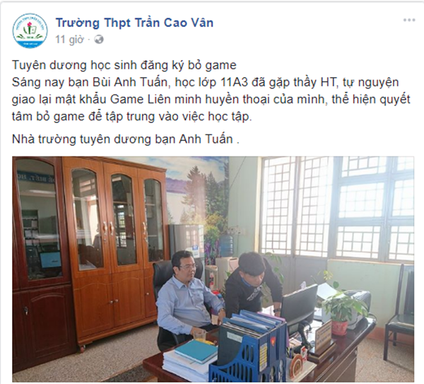 Mới đây trên fanpage của trường THPT Trần Cao Vân (thôn 3, xã Lah Lốp, huyện Chư Sê, tỉnh Gia Lai) đã đăng đoạn thông báo gây chú ý: "Tuyên dương học sinh đăng ký bỏ game. Sáng nay bạn Bùi Anh Tuấn, học lớp 11A3 đã gặp thầy HT, tự nguyện giao lại mật khẩu game Liên minh huyền thoại của mình, thể hiện quyết tâm bỏ game để tập trung vào việc học tập. Nhà trường tuyên dương bạn Anh Tuấn".