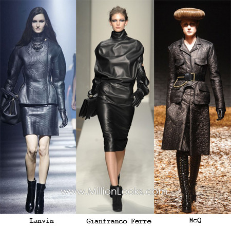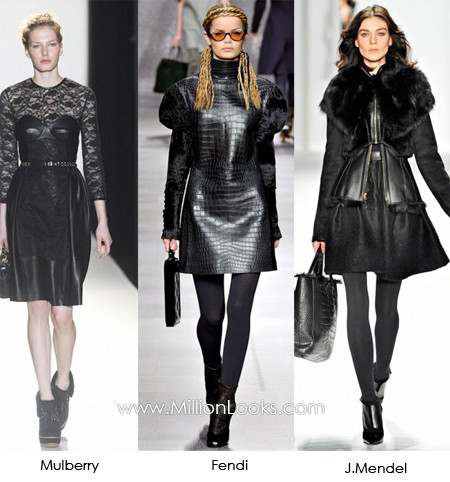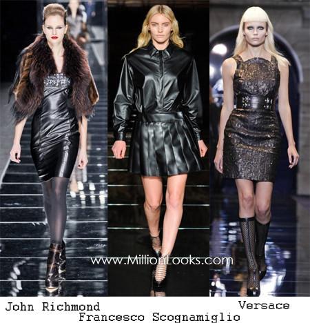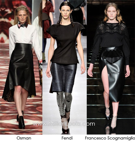 Váy da đã từng gây nên cơn sốt trong mùa xuân hè 2011 nhưng là với những gam màu đỏ mận, cam, xanh lục, xanh bạc hà… Nhưng tới mùa Thu – Đông 2012, váy da chủ yếu sử dụng tone màu đen với những dạng váy bút chì, váy không đối xứng, hay những chiếc váy da được trang trí bằng các họa tiết thêu hoặc đính thêm các loại hạt pha lê. Tuy nhiên những kiểu váy đơn giản không có quá nhiều chi tiết rườm rà vẫn được các quý cô ưa chuộng hơn.
