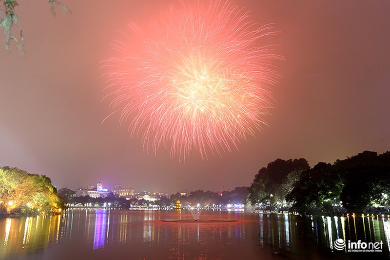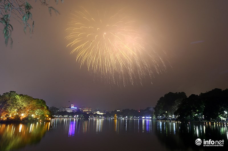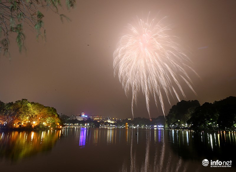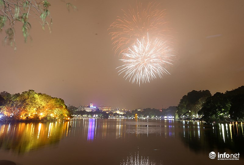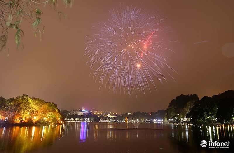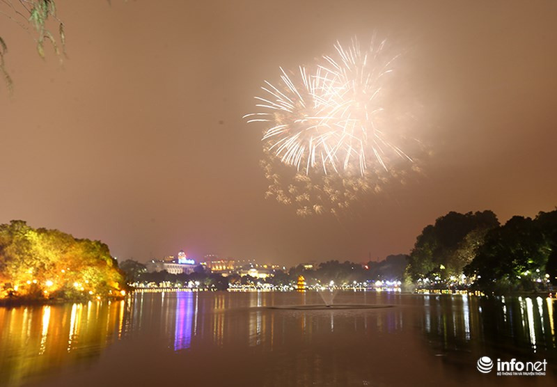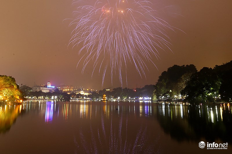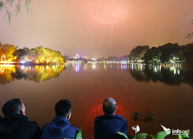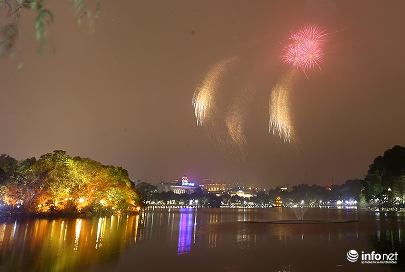 Giao thừa, mặc dù trời mưa và nhiều sương mù nhưng người dân Thủ đô cũng được mãn nhãn với màn pháo hoa tầm cao kéo dài 15 phút. Dưới đây là một số hình ảnh phóng viên Báo điện tử Infonet ghi nhận lại những màn pháo hoa trong đêm giao thừa tại Hồ Gươm:
