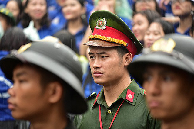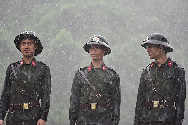Dù ướt mưa nhưng nhiều chiến sĩ công an, bộ đội vẫn cười tươi làm nhiệm vụ.