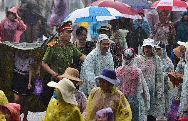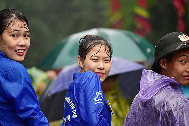 Lực lượng an ninh, tình nguyện viên đội mưa gió giữ gìn trật tự tại khuôn viên sân trung tâm. Họ tạo thành nhiều hàng rào chắn sống để đảm bảo Đền Hùng không "thất thủ" như năm 2016.