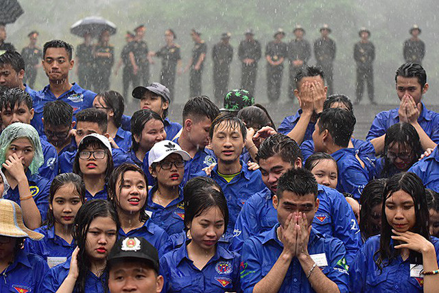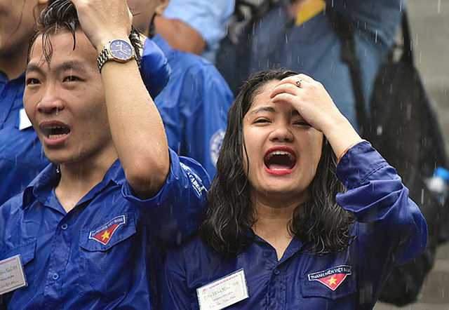 Họ hát vang bài ca về đoàn, cổ vũ tinh thần dưới cơn mưa to và nặng hạt.