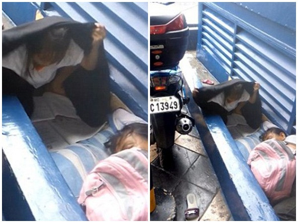 Khoảnh ghi lại vào khoảng 7h sáng 6/7 bên ngoài một khu chung cư ở Manila, Philippines. Cô bé trong ảnh là bé Lorensalie Elaine Dolfo (8 tuổi), học sinh lớp 3 trường tiểu học Aurora Quezon ở Manila. Bên cạnh em là người mẹ Ellen (40 tuổi) và em gái, Alexandra (4 tuổi), đang nằm ngủ.