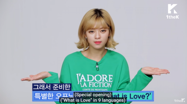 Ở giây 22 của đoạn video này, bạn sẽ thấy Jeongyeon hỏi mình “Tềnh iu là gì?”. Có thể thấy Jeongyeon nói vẫn chưa chuẩn xác, nhưng cô nàng chắc hẳn rất nỗ lực và tập luyện kỹ lắm, vì câu hỏi bốn từ này có tới ba dấu huyền, rất khó phát âm cho đúng.