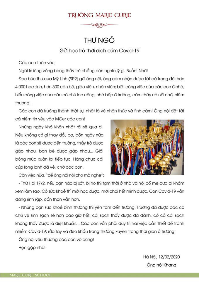 Mới đây, mạng xã hội bất ngờ lan truyền bức tâm thư thầy giáo Nguyễn Xuân Khang - Hiệu trưởng Trường Marie Curie gửi đến học sinh của mình trong mùa dịch corona.