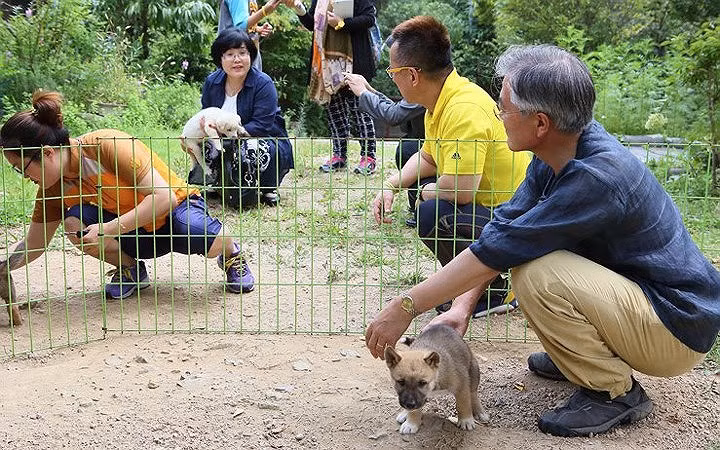 Trong ảnh là ông Moon Jae-in chăm sóc một trong những chú cún con của Maru với 1 cô chó hoang.