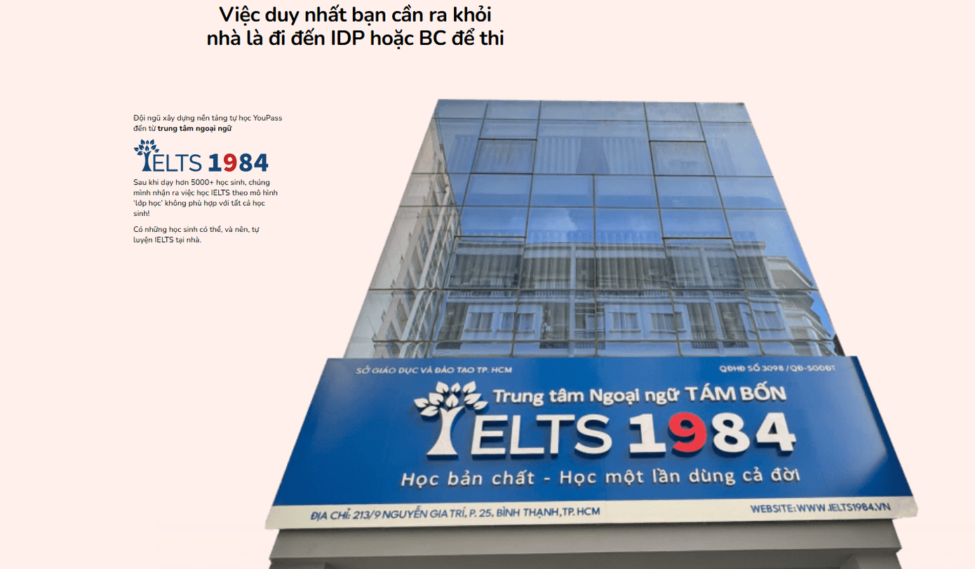 YouPass - IELTS Online Practice Platform, nền tảng học IELTS trực tuyến ra đời vào ngày 21/08/2023, được phát triển bởi đội ngũ giáo viên từ IELTS 1984, một trung tâm đáng tin cậy tại Việt Nam. YouPass áp dụng phương pháp Logical Framework©, đã được IELTS 1984 kiểm chứng và đăng ký sở hữu trí tuệ, giúp học viên học hỏi kiến thức IELTS theo một cấu trúc mạch lạc, từ cơ bản đến nâng cao, nắm vững các nguyên lý cốt lõi của kỳ thi mà không phải bỏ ra quá nhiều chi phí với thời gian học linh hoạt.
